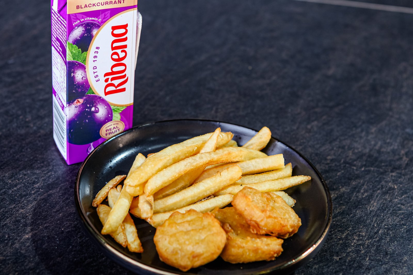 Three crispy, golden chicken nuggets served with a side of fries and a refreshing drink. Perfectly sized for little hands.
