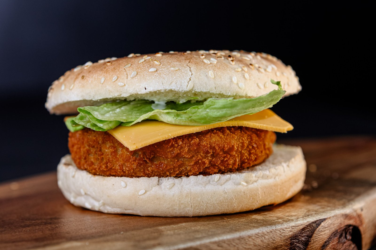 A wholesome patty made from fresh vegetables, chickpeas, and aromatic spices, served with crisp lettuce,creamy mayo and cheese slice on a soft toasted bun